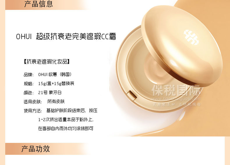 OHUI 歐蕙 超級抗衰老完美遮瑕CC霜 21號 象牙白 買一送一替換裝 防曬 美白 15g/盒—— 1 集中了BB霜的所有優點,改善了BB霜涂抹不勻、妝感厚、不自然等缺點 2 含有BABY膠原蛋白成分,延緩肌膚老化,打造彈力童顏的完美肌膚 3 集美白抗皺防曬于一身,一款即可解決多種問題,使用更方便 |