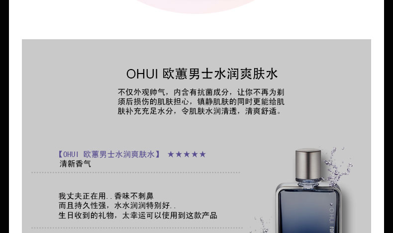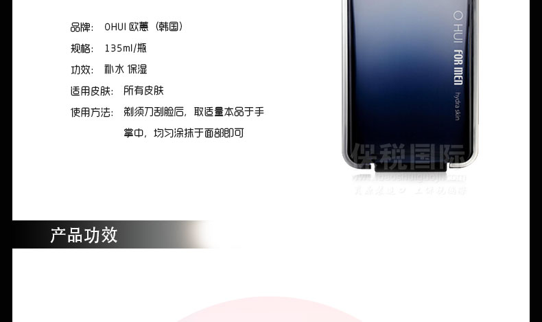 OHUI 歐蕙男士水潤爽膚水 135ml/瓶 補水 保濕 鎮(zhèn)靜 —— 1 有效去除肌膚表面的死皮細胞及多余油脂,打造干凈肌膚 2 含抗菌成分,能有效防止剃須劃傷引起的感染,讓你不再為損傷的肌膚擔心 3 鎮(zhèn)靜肌膚的同時,還可以提供皮膚充足的水分,使皮膚水潤有光澤 4 幫助改善肌膚彈性,減少暗瘡生成,凈化肌膚,使肌膚清爽舒適 注:敏感肌膚慎用,可隱蔽處進行皮膚測試后使用。 |