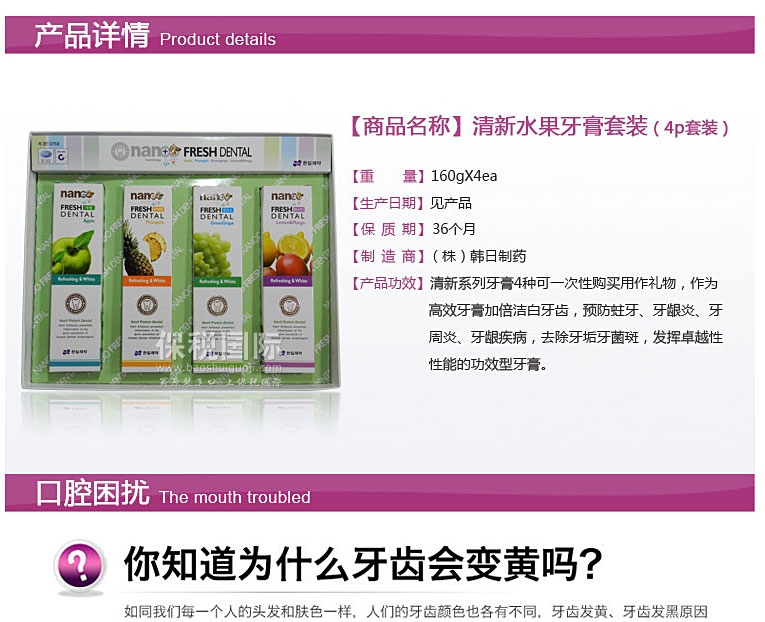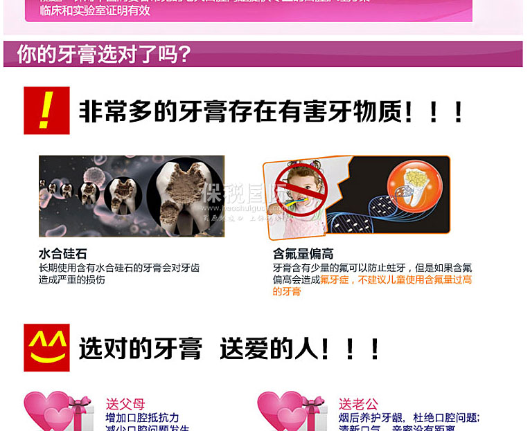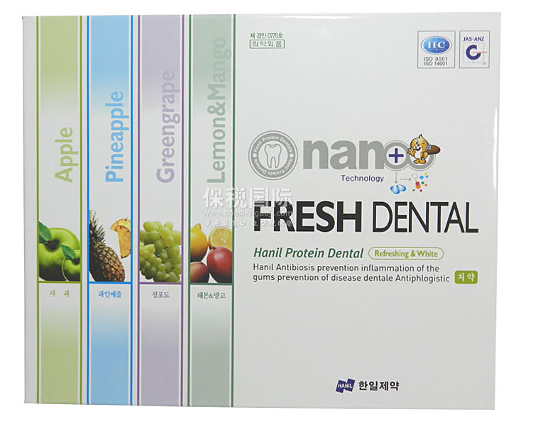 | 品 牌 | 韓日制藥HANIL | 功 效 | 潔白牙齒,預(yù)防蛀牙、牙齦炎、牙周炎、牙齦疾病,去除牙垢牙菌斑。 | |