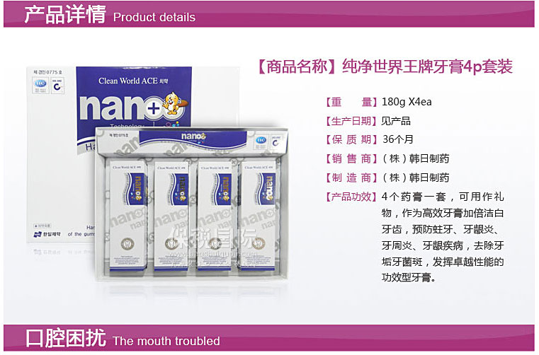 商品名稱 | 韓國韓日制藥HANIL純凈世界王牌 潔白堅固牙齒 預防蛀牙 去口臭牙膏 4支套裝 180g *4個 | ||