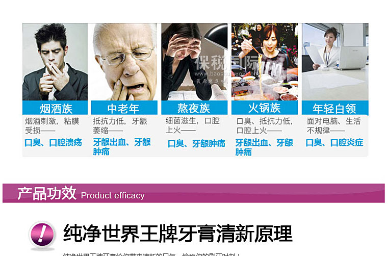 預防牙齦變色、出血、炎癥、膿腫等牙齦病癥和牙齦炎、牙周炎等亞洲病癥,潔白堅固牙齒,預防蛀牙,去除口臭 |