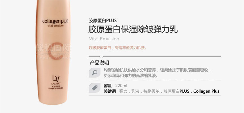拉格貝爾膠原蛋白保濕除皺彈力乳 強效營養 溫和易吸收 220ml/瓶—— 1.含有的超級膠原蛋白有助于增強肌膚抵抗力,漿果混合物有助于締造年輕活力的肌膚。 2.物美價廉,性價比超高。 |
