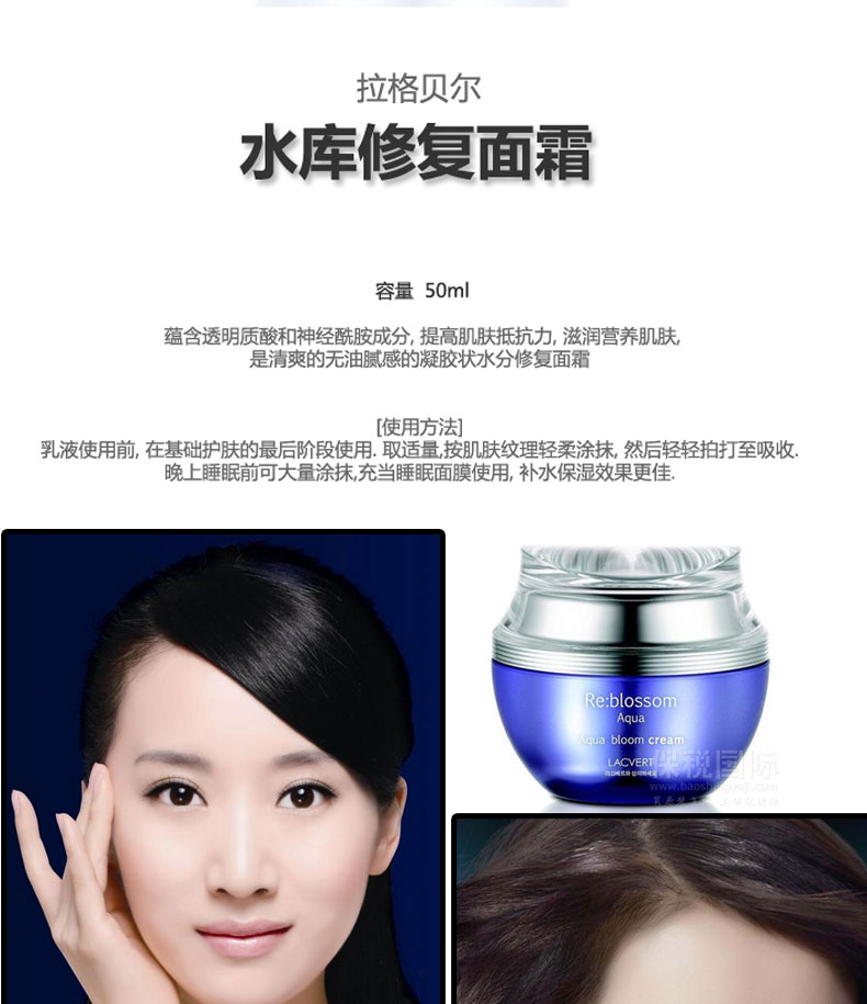 拉格貝爾水庫修復面霜 滋潤營養肌膚 清爽無油膩感 50ml/瓶 —— 1.乳液使用前,在基礎護膚的最后階段使用。 2.取適量,按肌膚紋理輕柔涂抹,然后輕輕拍打至吸收。 3.晚上睡眠前可大量涂抹,充當睡眠面膜使用,補水效果更佳。 |