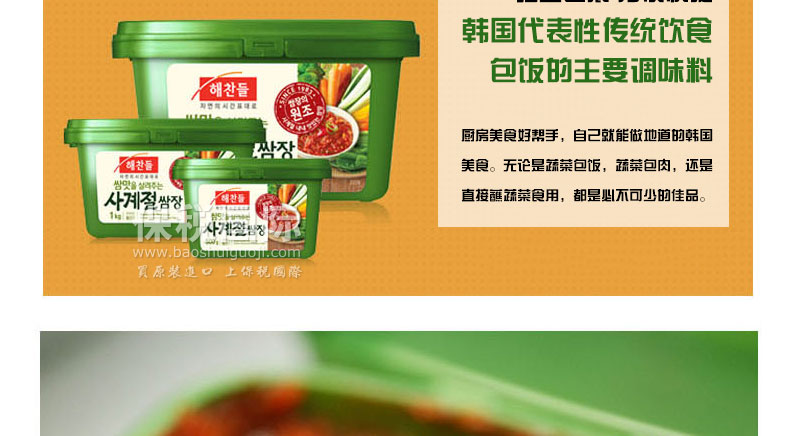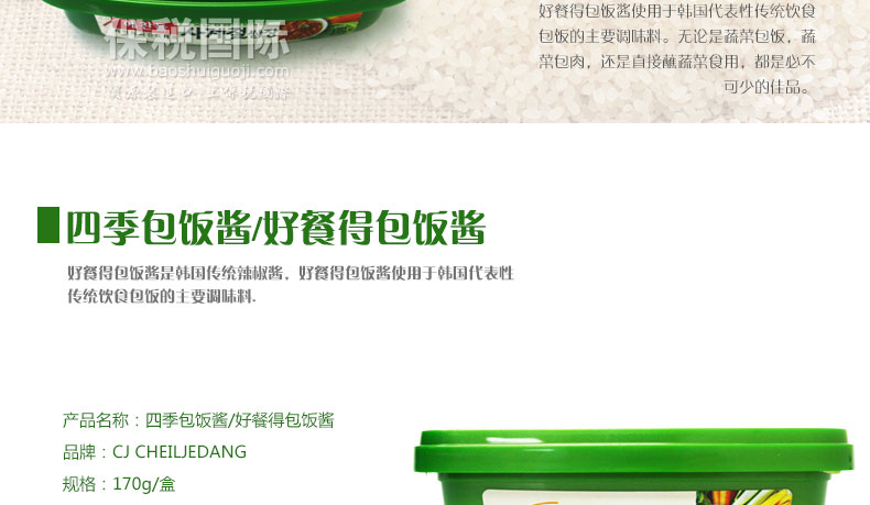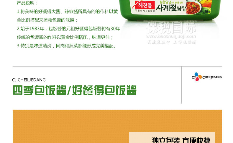 四季包飯醬/好餐得包飯醬 韓國風(fēng)味 獨(dú)立包裝 方便快捷 170g/盒 1盒—— 1.將美味的好餐得大醬、辣椒醬所具有的的作料以黃金比例搭配來拯救包飯的味道; 2.始于1983年,包飯醬的元祖好餐得包飯醬將有30年傳統(tǒng)的包飯醬的作料以黃金比例搭配,味道更佳; 3.特別是味道清淡,同肉和蔬菜都能形成完美搭配。 |
