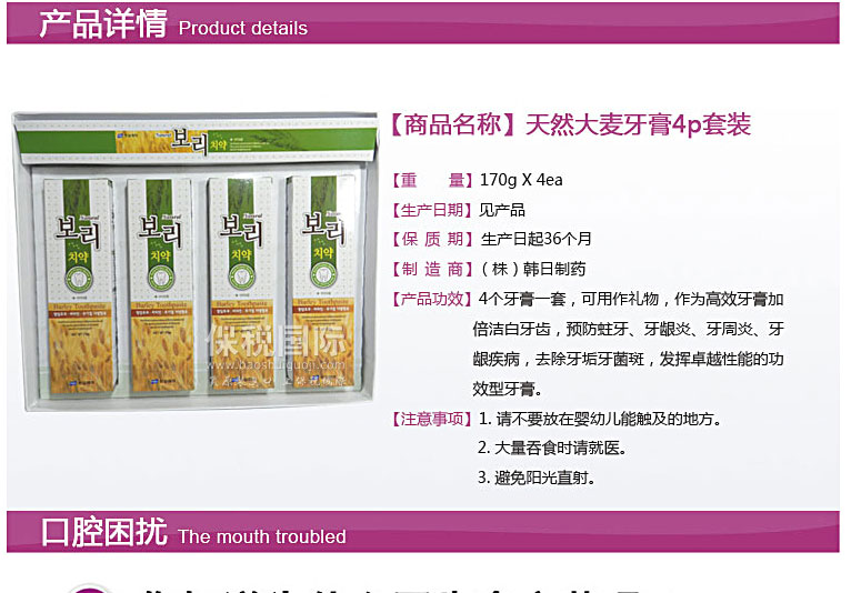商品名稱 | 韓國韓日制藥HANIL天然大麥去除牙垢潔白牙膏 4支套裝 | ||