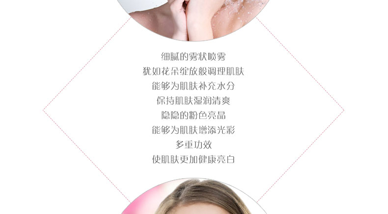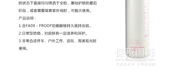 拉格貝爾 綻放UV粉色防曬噴霧 多重美白 極致護膚 50ml/瓶 —— 1.含FADE-FROOF功能能夠持久維持妝容。 2.日常型防曬,對皮膚有一定滋養和保護。 3.非常合適開車、戶外工作、逛街、海灘觀光時使用。 |