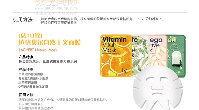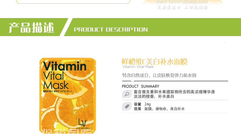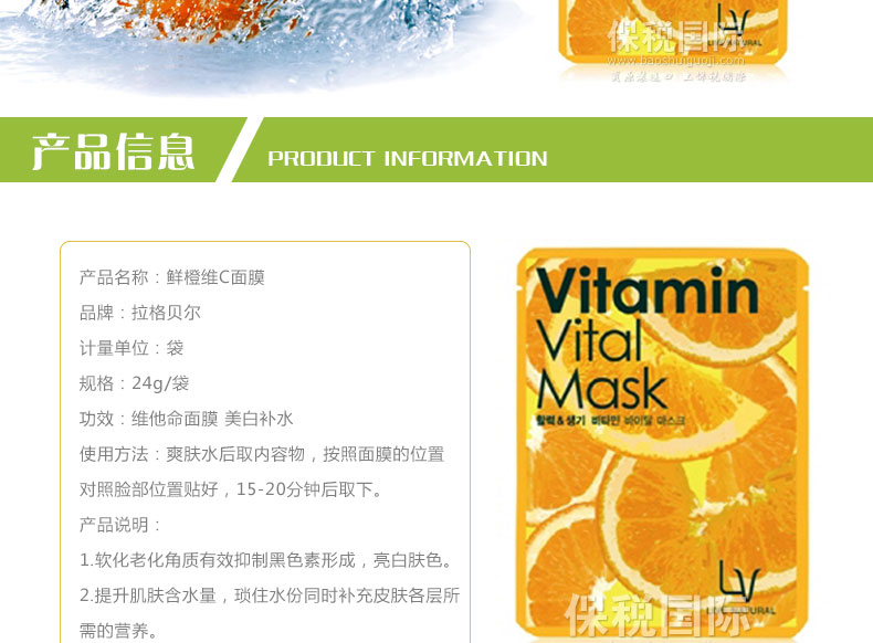 拉格貝爾 鮮橙維C 美白補(bǔ)水面膜 24g/袋?—— 1.軟化老化角質(zhì)有效抑制黑色素形成,亮白膚色。 2.提升肌膚含水量,瑣住水份同時(shí)補(bǔ)充皮膚各層所需的營(yíng)養(yǎng)。 |