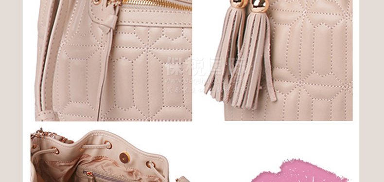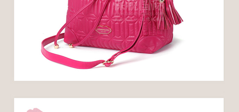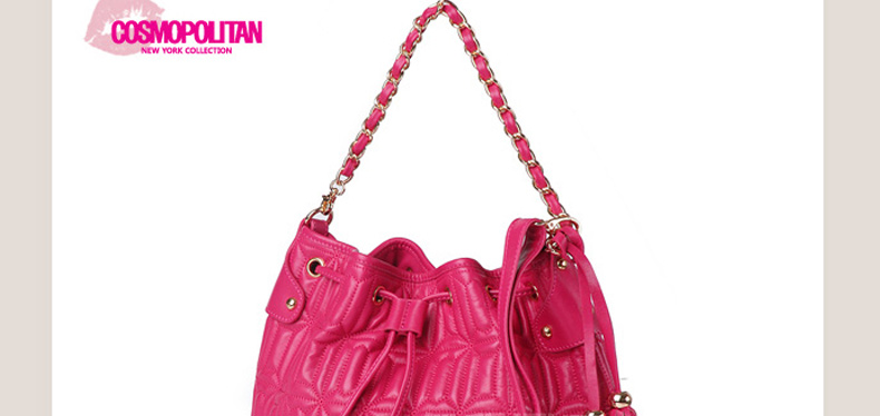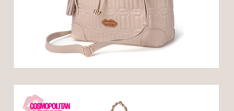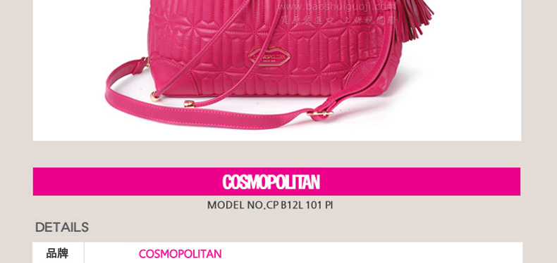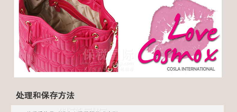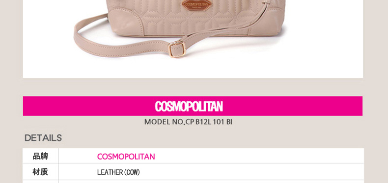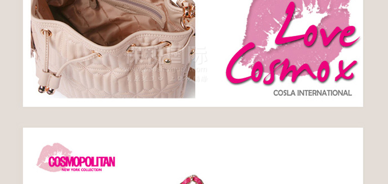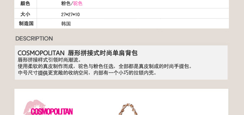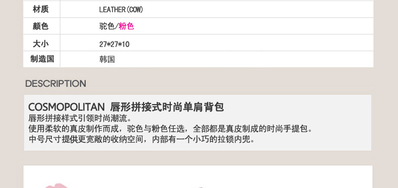 | 產品說明 | COSMOPOLITAN 唇形拼接式時尚單肩背包—— 1.唇形拼接樣式引領時尚潮流。 2.使用柔軟的真皮制作而成,駝色與粉色任選,全部都是真皮制成的時尚手提包。 3.中號尺寸提空更寬敞的收納空間,內部有一個小巧的拉鎖內兜。 | |||