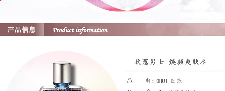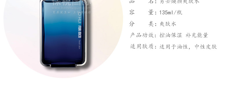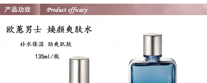 歐蕙男士 煥顏爽膚水 補水保濕 勁爽肌膚 135ml/瓶?—— 針對由于皮脂大量分泌導致毛孔過大、皮膚出油量增多,但同時皮膚反而變得更加干燥的人群而準備的清爽型爽膚水。能夠鎮定剃須后變得敏感的皮膚,同時為肌膚提供所需水分,賦予肌膚清爽舒適感,還您一個干凈亮白的皮膚。 |