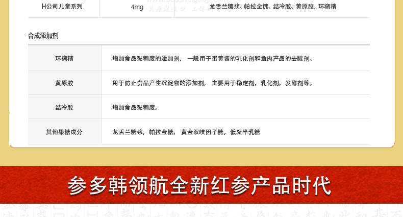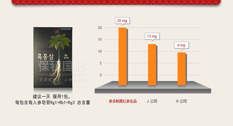 參多韓黑紅參名品版 黑紅參精華濃縮液 韓國6年根高麗參紅參人參—— 原材料及含量:黑紅參粉末提取液81.17%(韓國產,蒸餾水,固形粉4.7%以上,紅參成分3.6mg/g)原材料參比率:黑紅參根100%,紅參濃縮液4.3(韓國產,固形粉60%,人參皂苷Rg1+Rb1+Rg3 10mg/g,紅參成分70mg/g)1%,原材料參比率:紅參根70%,紅尾參30% 營養信息:1天服用1包,熱量10kcal,碳水化合物2g,糖類3g,蛋白質0g,脂肪0g,鈉5mg |