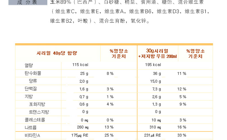 1.成分表:玉米89%(巴西產(chǎn))、白砂糖、精鹽、食用油、糖飴、混合維生素(維生素C,維生素E,維生素A,維生素B6,維生素D3,維生素B1,維生素B2,葉酸)、混合生育酚,氧化鋅。 |