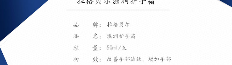 商品名稱 | 拉格貝爾滋潤護手霜 保濕滋潤 嫩白抗皺 柔滑抗衰 50ml/支 | ||