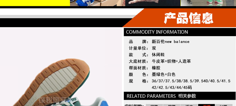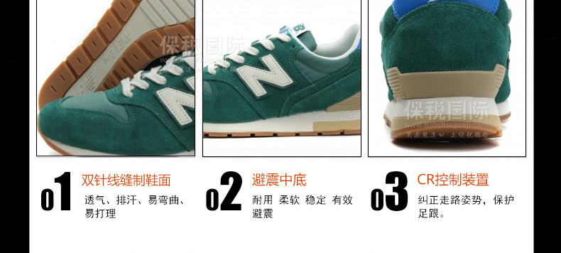 新百倫new balance 中性墨綠色白色休閑鞋 撞色運動鞋 MRL996ER-0D —— 1.藍色休閑運動鞋。 2.網面運動鞋,透氣性好,鞋面為人造革。 3.橡膠鞋底,舒適輕便。 4.大底材質:橡膠;幫面材質:織物+人造革。 |