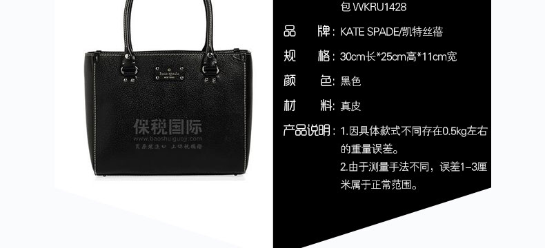 Kate Spade凱特·絲蓓 立體輪廓女士黑色真皮單肩手提包 WKRU1428?—— 1.因具體款式不同存在0.5kg左右的重量誤差。 2.由于測量手法不同,誤差1-3厘米屬于正常范圍。 |