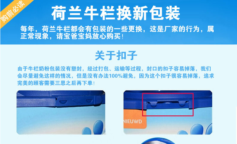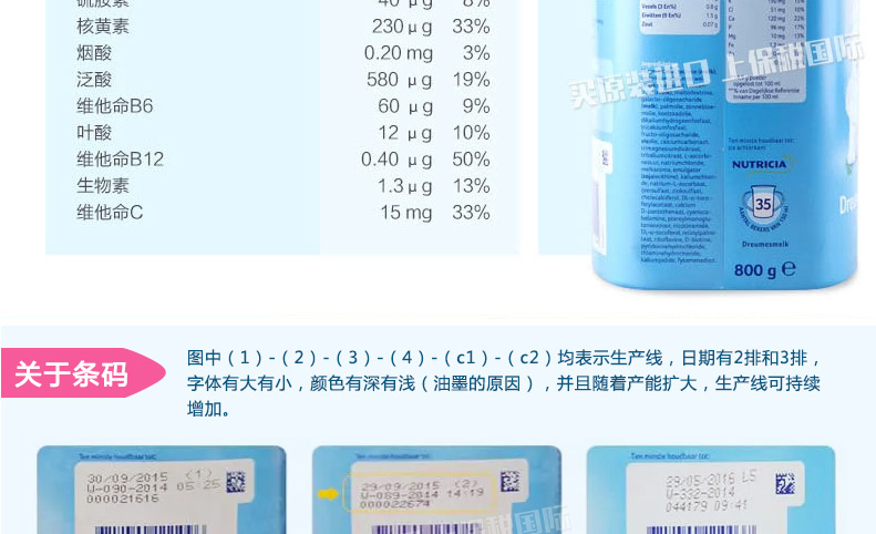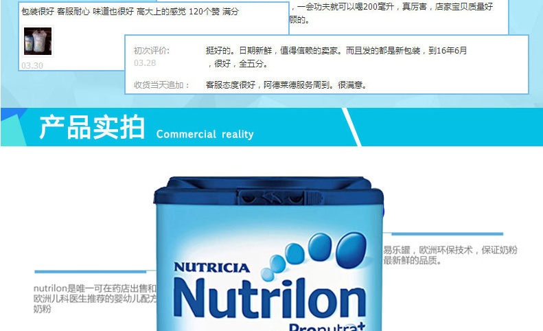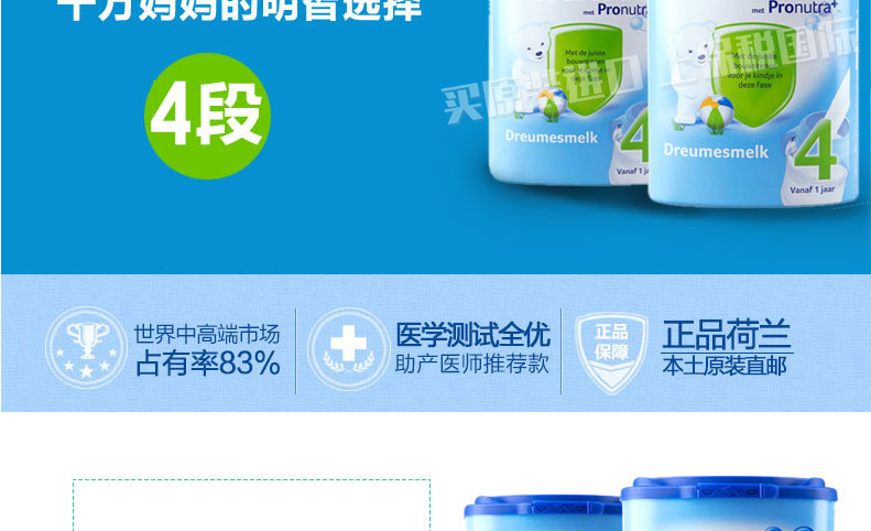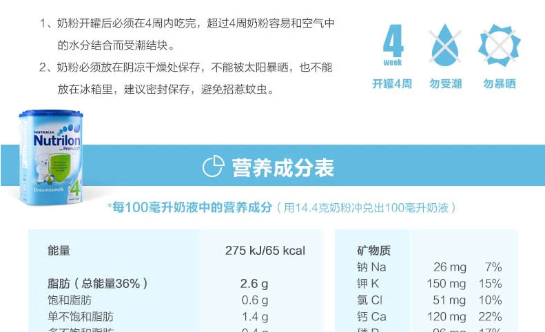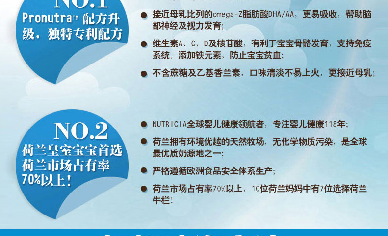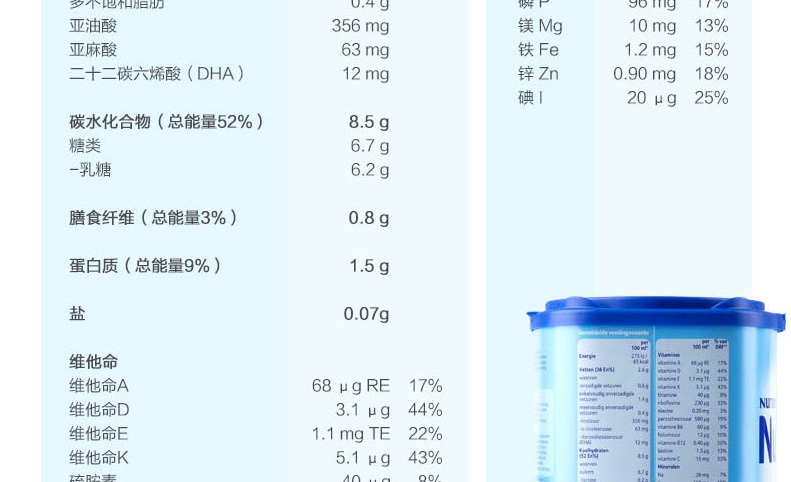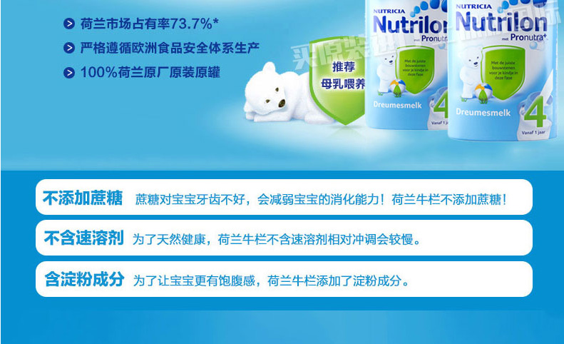 荷蘭原裝進口 Nutrilon牛欄本土嬰兒奶粉4段 寶寶開心 媽媽放心 —— 1.最接近母乳的奶粉,口味清淡,含益生元組合,未添加蔗糖和乙基香蘭素,有助于改善腸道。 2.添加DHAAA幫助腦部及視力發育,健康益智。 3.含有維生素A,C,D及核苷酸,有助于骨骼增長,增強免疫力。 4.蘊含豐富的鈣和磷,鐵質,蛋白質和鹽,增強抵抗力,幫助寶寶腦部及視力的發育。 注:奶粉包裝更新換代頻繁,請以收到實物為準。 |