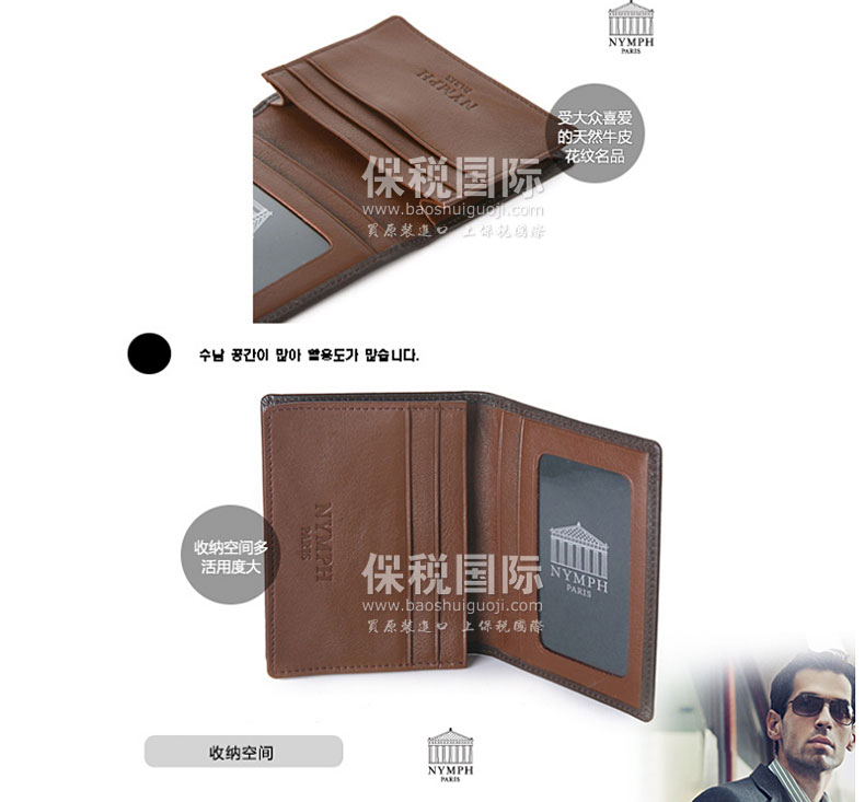 韓國NYMPH棕色TWO-TONE天然牛皮花紋男士名片夾—— 1. NYMPH所有產品都是采用韓國的天然皮革,20年來都是由工匠們一針一線手工制作而來的。 2. 收納空間多,活用度大。 3. 3個卡位,1個相片位,1個(大)名片位。 4. 以現代簡約的時尚風格和突出的設計理念,還原經典、持久耐用、擁有價值的產品。 5. NYMPH的所有產品均是在韓國100%原單生產,是韓國設計師精心制作出的手工制品。 6. 印有NYMPH巴黎Logo的硬包裝盒直接作為禮品盒用也很不錯。 |