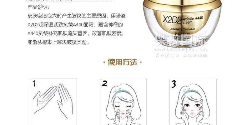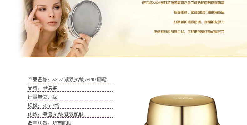 伊諾姿 X2D2 超保濕緊致抗皺 A440 面霜 50ml/瓶—— 皮膚密度變大時產生皺紋的主要原因,伊諾姿X2D2超保濕緊致抗皺A440面霜,蘊含神奇的A440抗皺補充肌膚流失營養,改善肌膚密度,能夠從根本上解決皺紋問題。 |