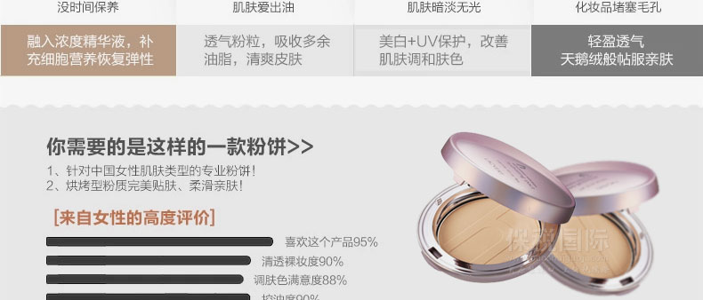 1.盈潤保濕粉餅涂抹后緊貼肌膚,無需多層涂抹。打造肌膚如喝足水般的細(xì)膩和光滑感。 |