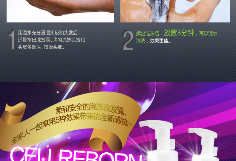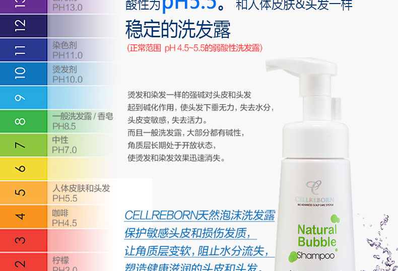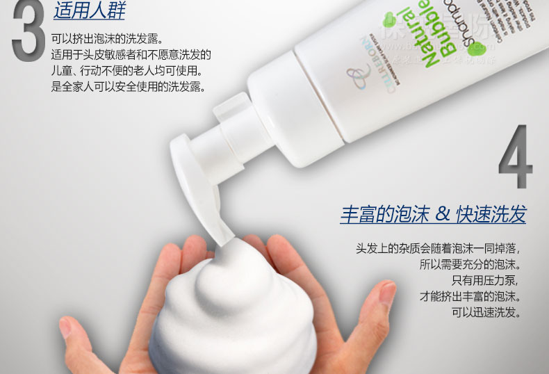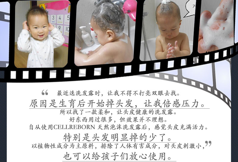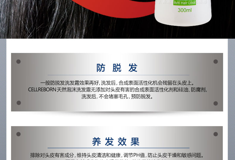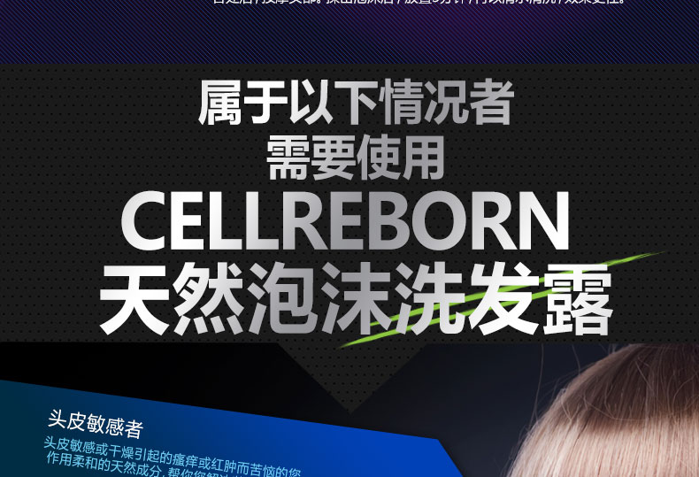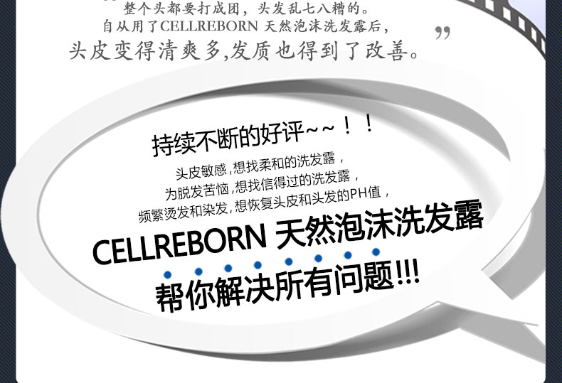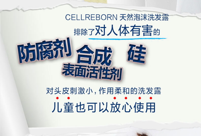 CELLREBORN 純天然敏感頭皮泡沫洗發露 300ml/瓶—— 1.富含植物成分和毛發蛋白質,為秀發帶來營養健康。 2.預防分娩/壓力引起的脫發,解決頭發稀疏者的煩惱。 3.使用安全可靠的天然成分,無添加防腐劑、硅膠、合成表面活性劑,兒童也可使用。 4.中和堿性頭皮和毛發,恢復原來健康的弱酸性,作用于敏感頭皮,效果柔和安全。 |