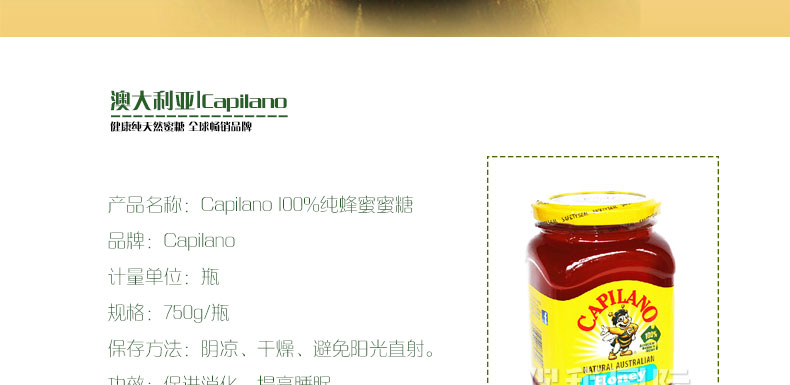 商品名稱 | 澳大利亞 Capilano 100%純蜂蜜 健康純天然蜜糖 全球暢銷品牌 750g/瓶 | ||