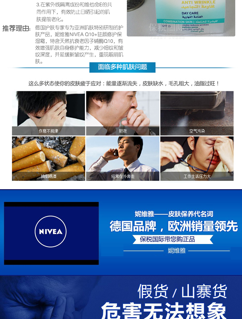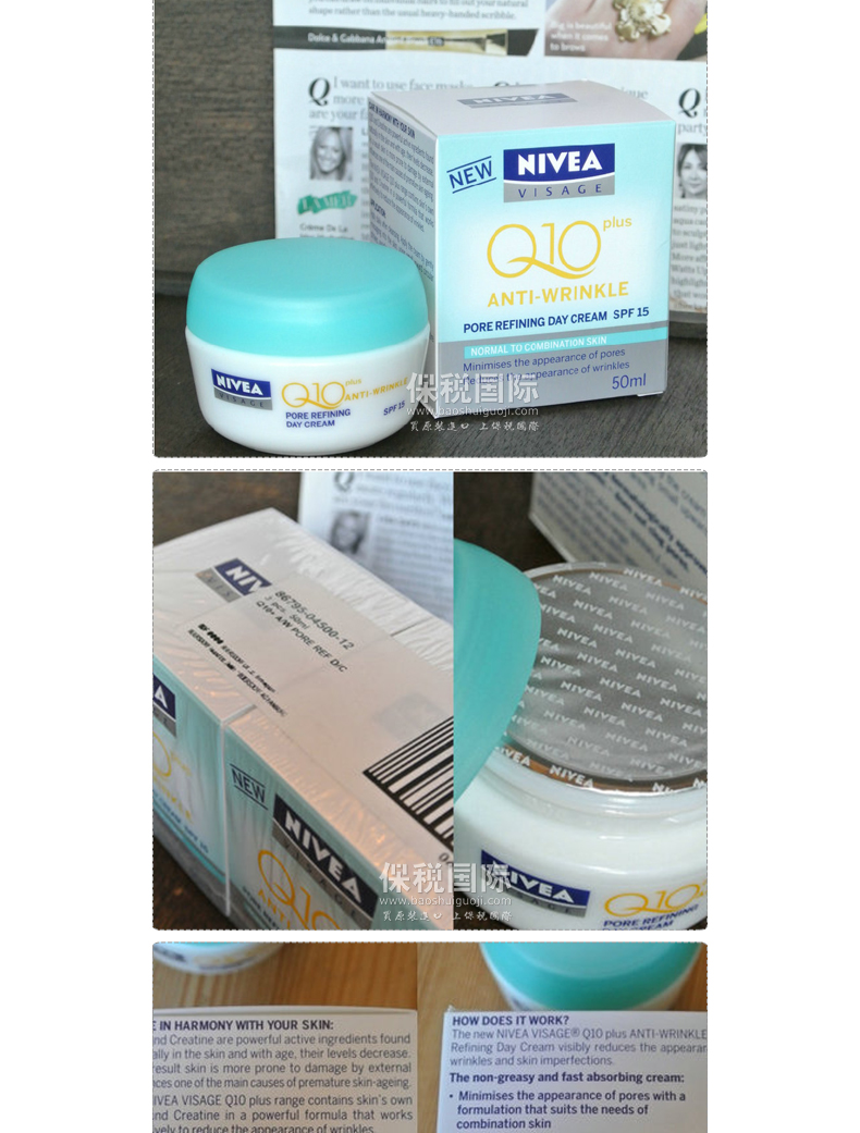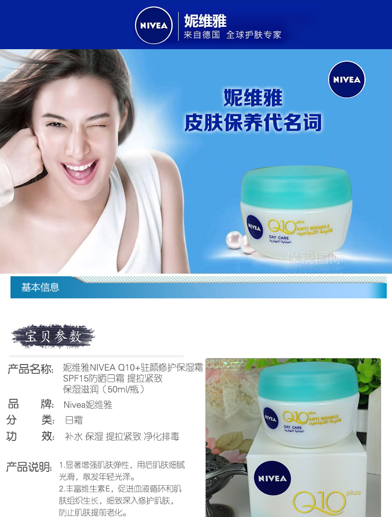 產品說明 妮維雅NIVEA Q10+駐顏修護保濕霜 SPF15防曬日霜 提拉緊致 保濕滋潤(50ml/瓶)——