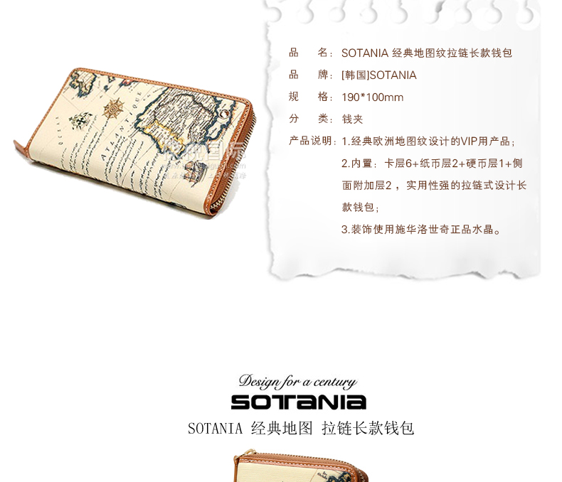 商品名稱 | SOTANIA 經典地圖紋拉鏈長款錢包 時尚百搭 功能性強 6卡層+2紙幣層+1硬幣層+2側面附加層 | ||
