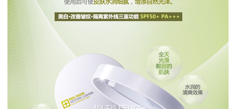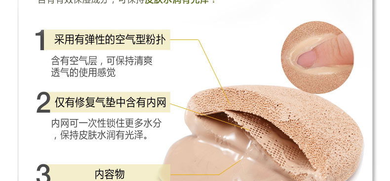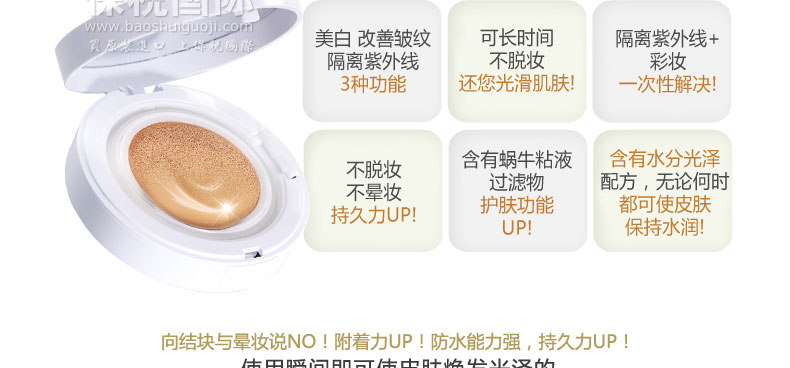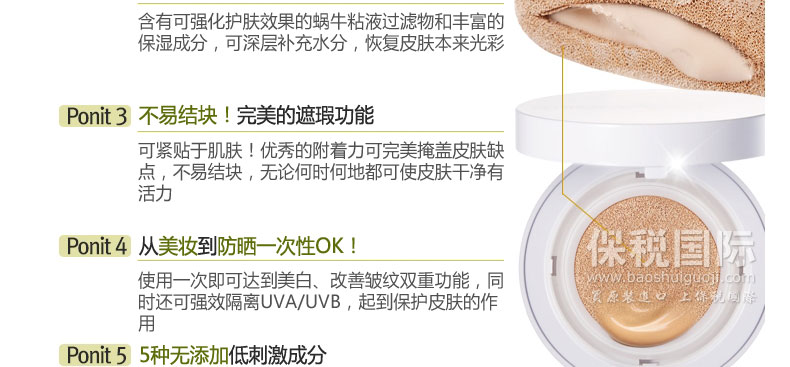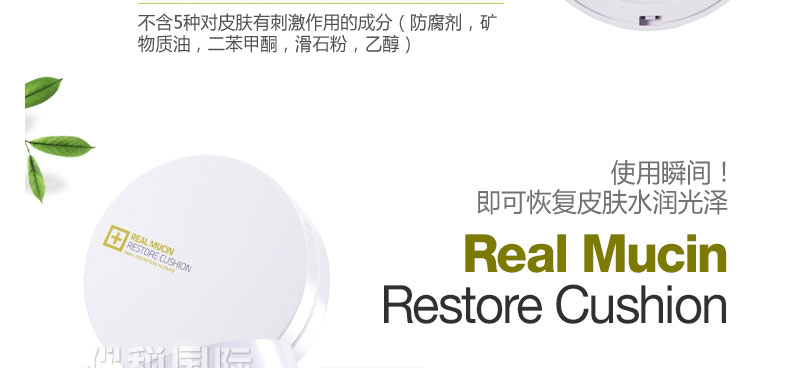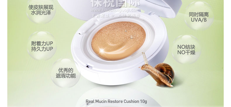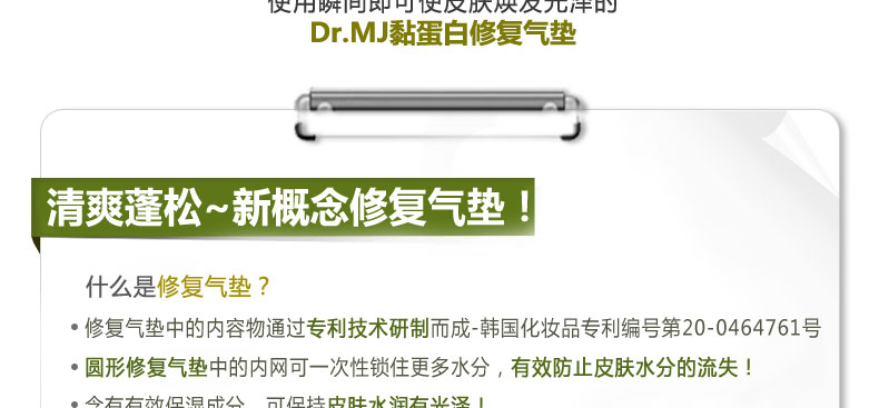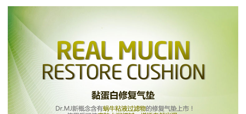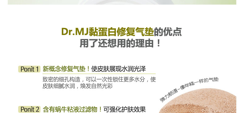 1.Dr.MJ新概念含有蝸牛粘液過濾物的修復氣墊,使用后可使皮膚水潤細膩,增添自然光澤。 |