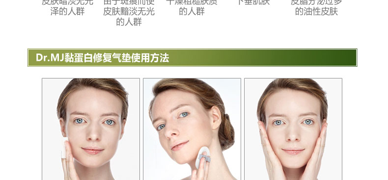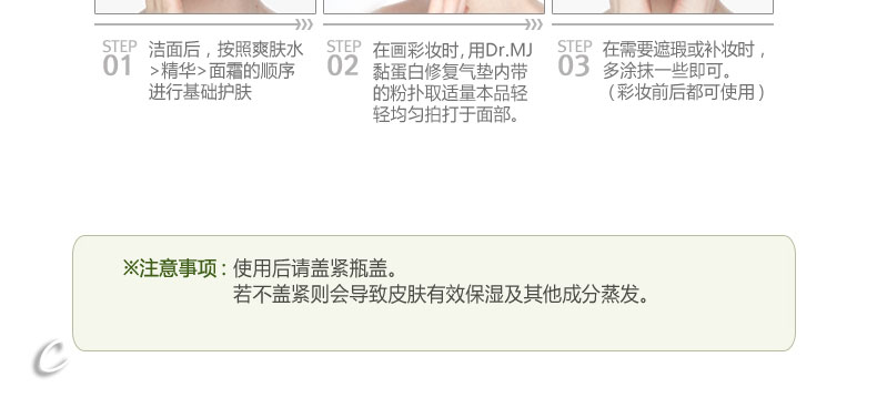 在畫彩妝時,用Dr.MJ黏蛋白修復氣墊內帶的粉撲取適量本品輕輕均勻拍打于面部。 | |||