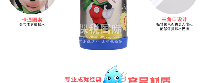 1.特制軟硅膠吸嘴,彈性好,耐咬耐磨,進口食品級PP材質,不含雙酚A,給寶寶一杯健康水。 |