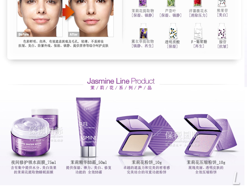 | 主要成分 | 茉莉花提取物 蘆薈葉 洋薔薇花水 熊果苷 薰衣草提取物 透明質酸 β-葡聚糖 腺苷 |