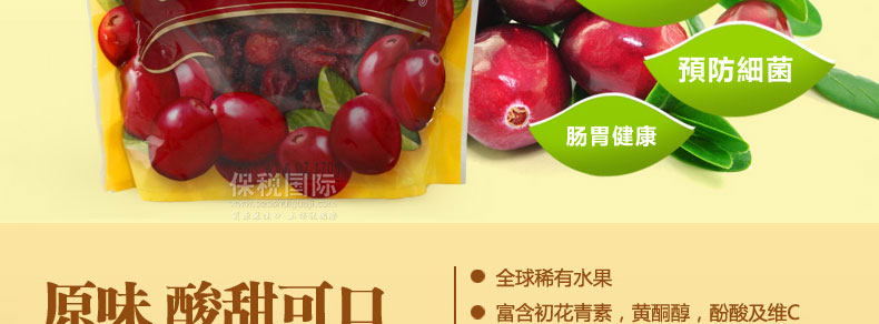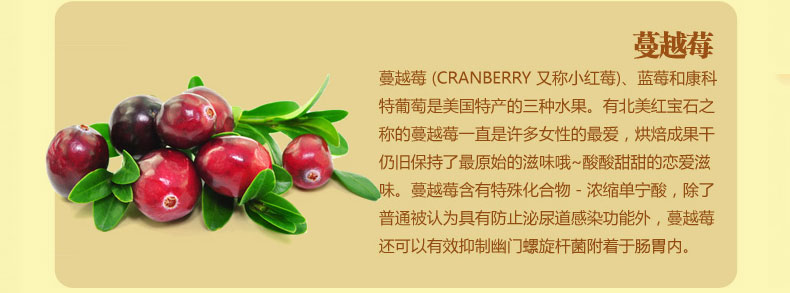 1.采用美國(guó)加州種植的新鮮蔓越莓,提供人體天然抗生素,色澤瑰麗,酸甜可口。