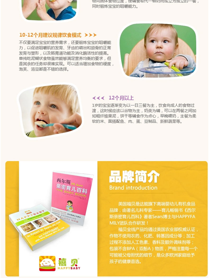 禧貝對嬰幼兒營養的專注,對關懷呵護精益求精的追求,只因百年不變的母愛之心。happy baby嬰兒輔食,針對輔食添加初期寶寶生長發育所需,科學強化各種營養成分,細膩易消化,是寶寶首次添加輔食的最佳選擇。
