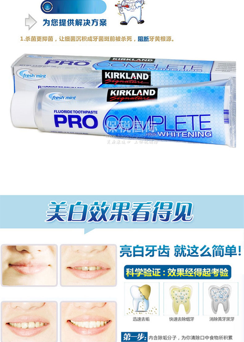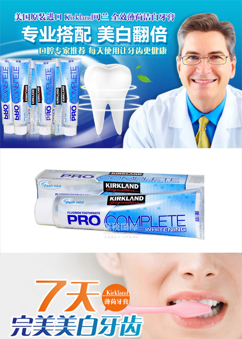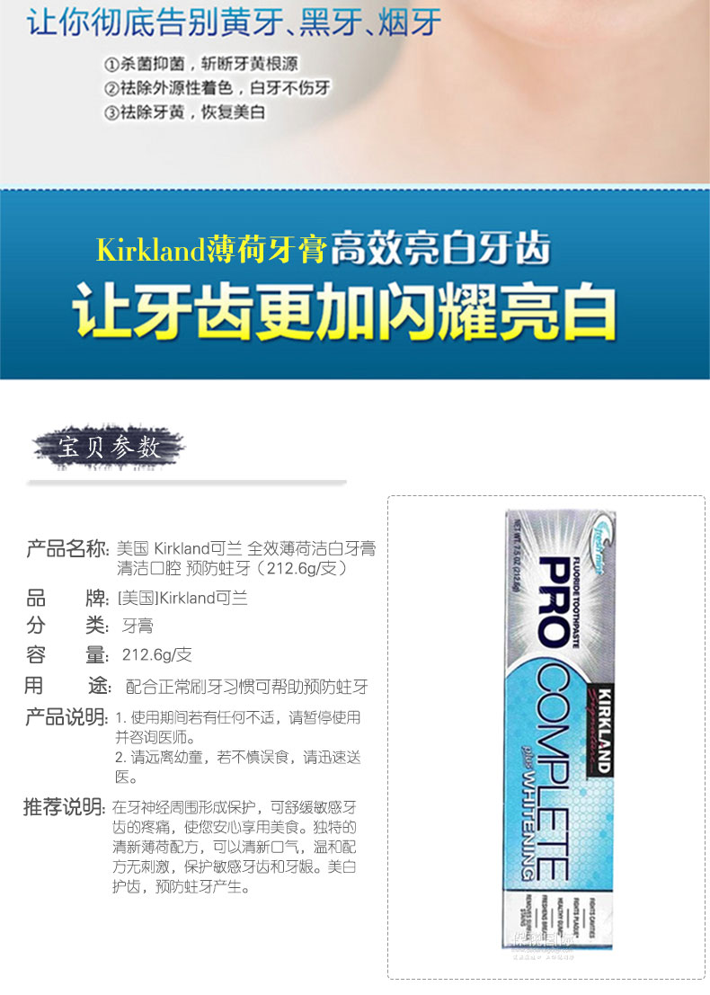 美國 Kirkland可蘭 全效薄荷潔白牙膏 清潔口腔 預(yù)防蛀牙(212.6g/支)——