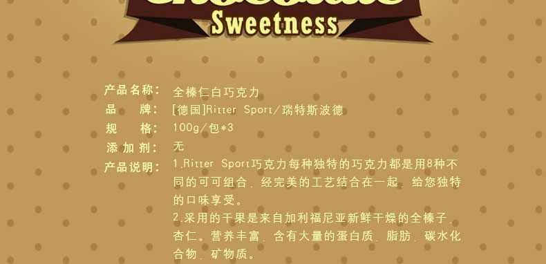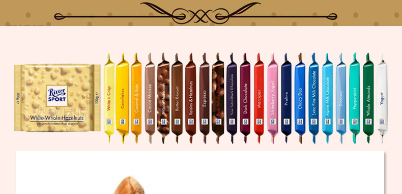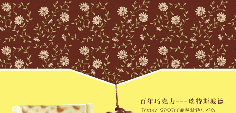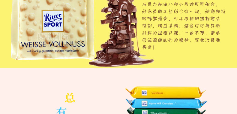 1.Ritter Sport巧克力每種獨特的巧克力都是用8種不同的可可組合,經完美的工藝結合在一起,給您獨特的口味享受。 |