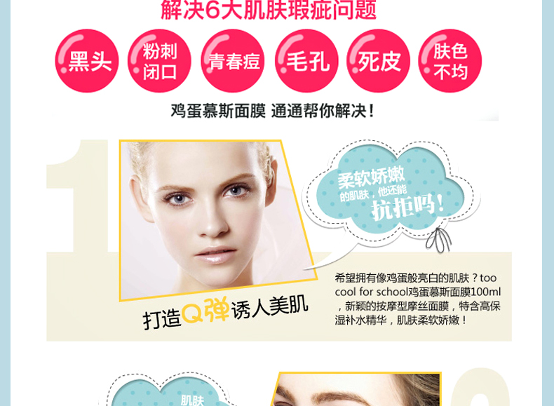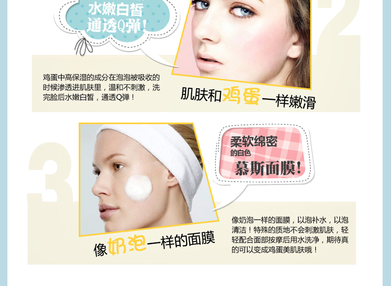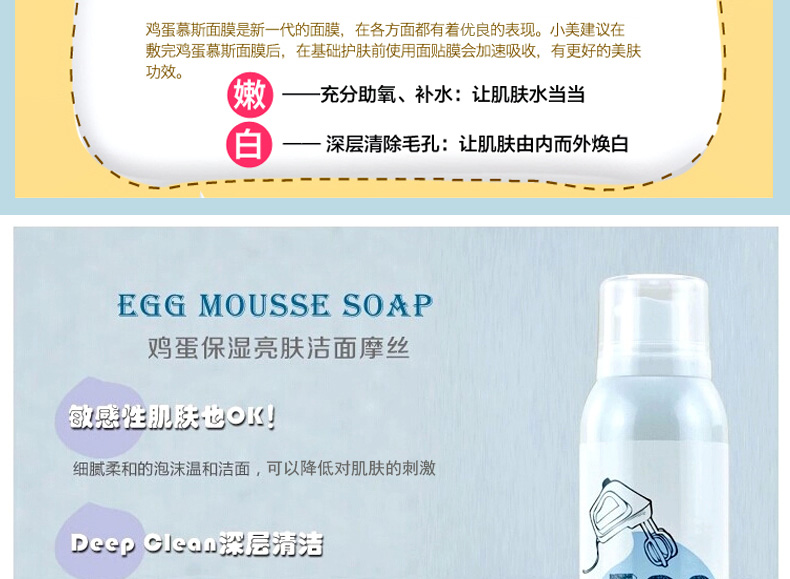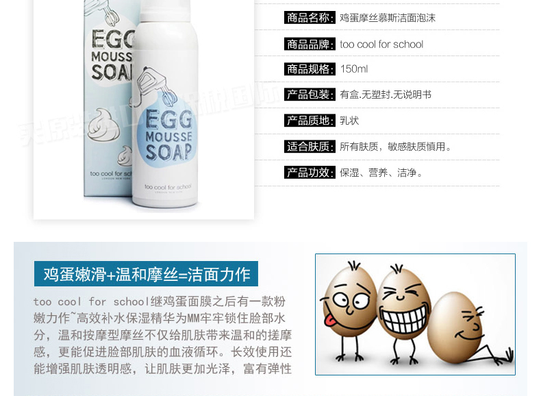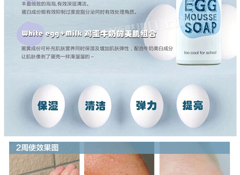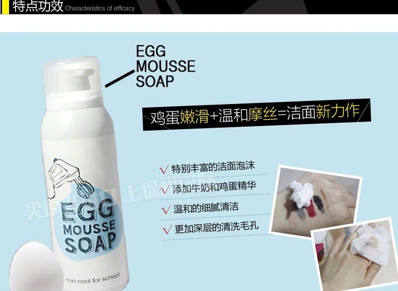 韓國too cool for school 雞蛋摩絲慕斯潔面泡沫洗面奶 牛奶+雞蛋—— 1.豐盈細致的泡泡,有效深層清潔。 2.蛋黃成分可補充肌膚營養同時保濕及增加肌膚的彈性。 |