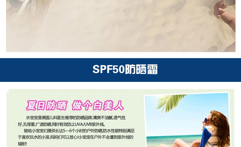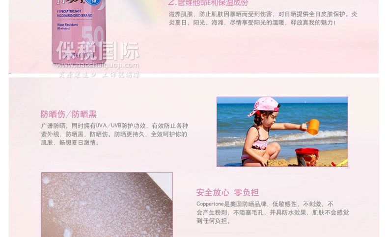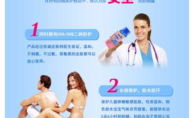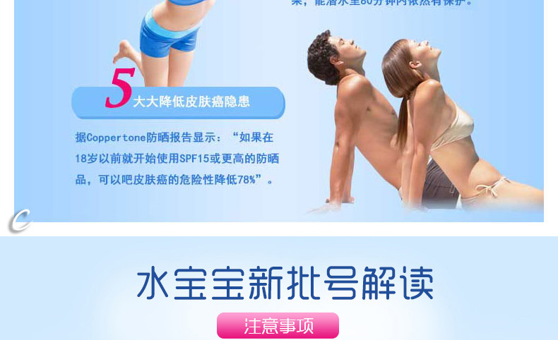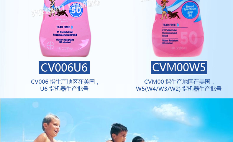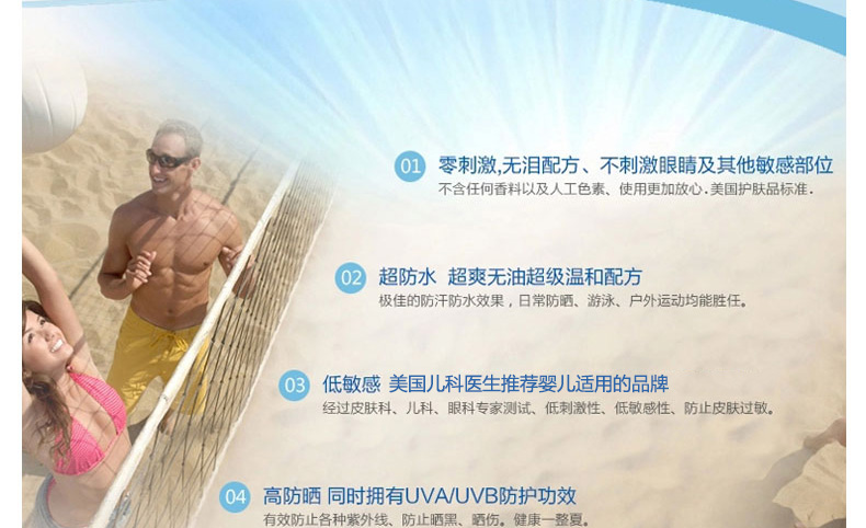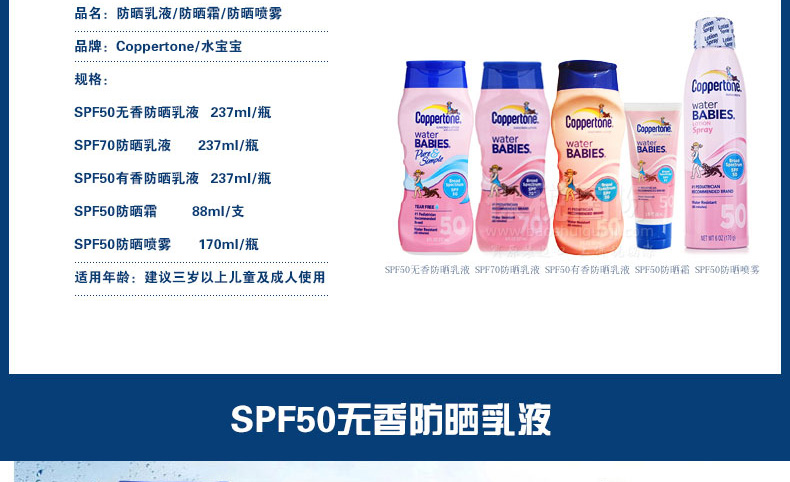 SPF50無香防曬乳液237ml/瓶;SPF70有香防曬乳液237ml/瓶;SPF50有香防曬乳液 237ml/瓶;SPF50防曬霜 88ml/支;SPF50防曬噴霧170ml/瓶 |
