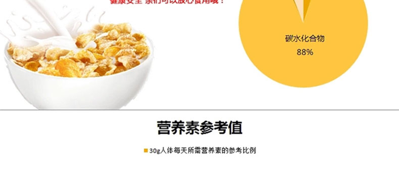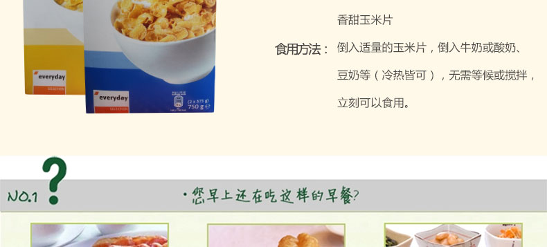 比利時進口Everyday Corn Flakes玉米片 即食營養早餐 營養谷物早餐 下午茶—— 1.采用優質原料,純凈自然,不含添加劑,富含多種維生素。 2.采用先進工藝,最大限度保留了玉米的營養價值,保持了玉米的原色和口味。 食用方法:倒入適量的玉米片,倒入牛奶或酸奶、豆奶等(冷熱皆可),無需等候或攪拌,立刻可以食用。 |