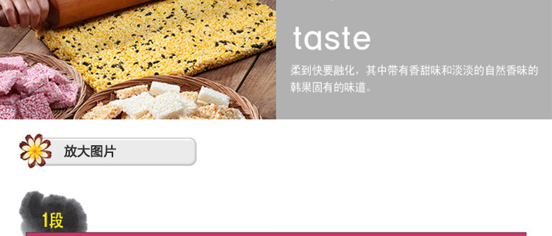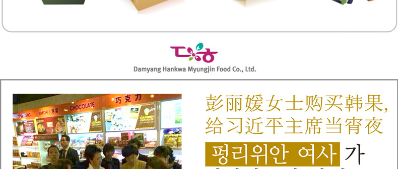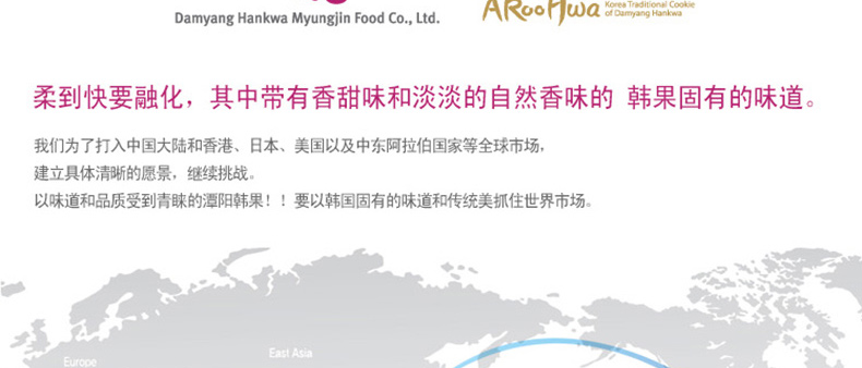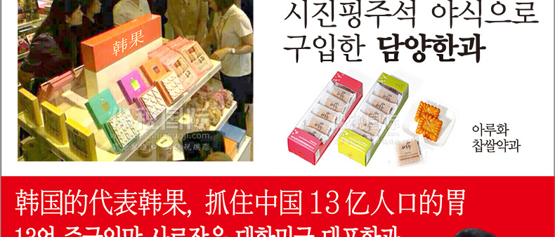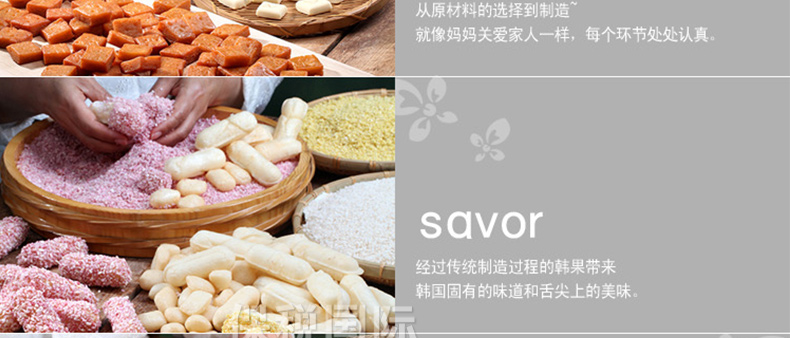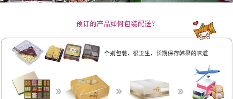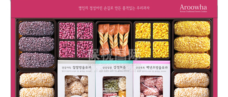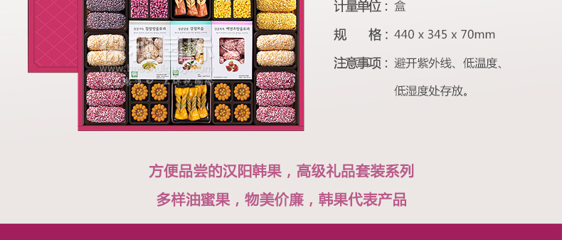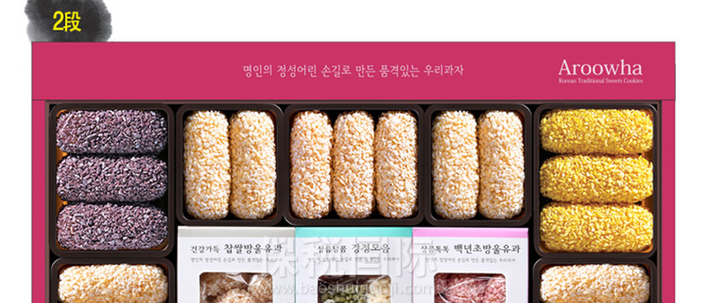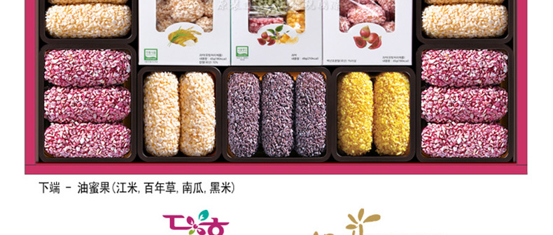 愛(ài)如花 竹香 Juk-yheng 韓果系列? 韓國(guó)代表糕餅公司榮譽(yù)出品—— 1.禮盒上端 - 茶食(綠豆, 百年草),? 油蜜果(江米,百年草, 黑米,南瓜), 蜜油餅,? 江米塊(百年草,桑葉,柚子,大米), 小油蜜果(江米, 百年草),蜜油餅 2.禮盒下端 - 油蜜果(江米,百年草,南瓜,黑米) 3.“愛(ài)如花”是使用來(lái)自大自然的材料做出味道、模樣及顏色都優(yōu)秀并包含大師的一顆真誠(chéng)之心的最優(yōu)秀的韓果品牌。 |
