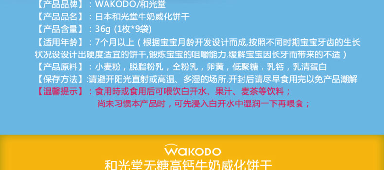 Wakodo和光堂 牛奶威化餅干 幼兒輔食 7個(gè)月以上寶寶零食 2盒裝 —— 1.營(yíng)養(yǎng)豐富,蓬松脆口,寶寶的最愛。 2.便于攜帶的獨(dú)立包裝。 3.不含染色劑、防腐劑、香料。