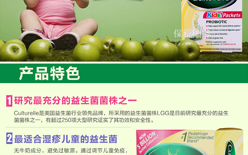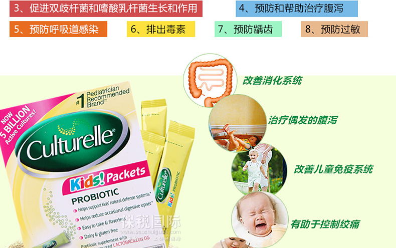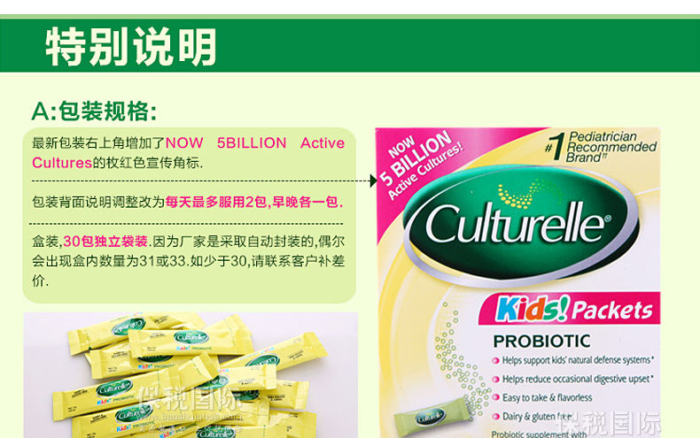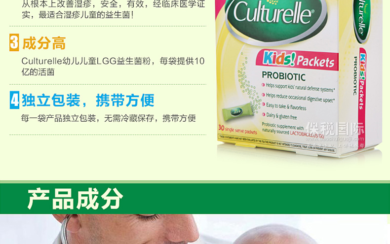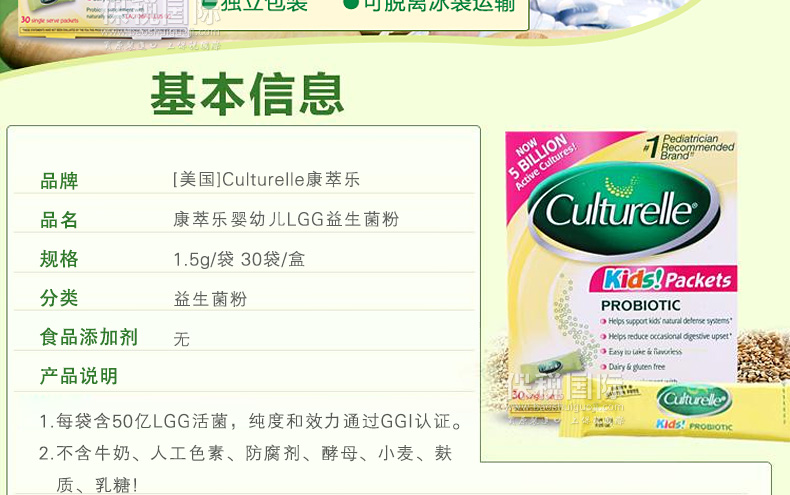 美國Culturelle for kids 康萃樂嬰幼兒LGG益生菌粉 緩解寶寶濕疹便秘拉肚子(30袋/盒) —— 1.每袋含50億LGG活菌,純度和效力通過GGI認證。 2.不含牛奶、人工色素、防腐劑、酵母、小麥、麩質、乳糖! |
