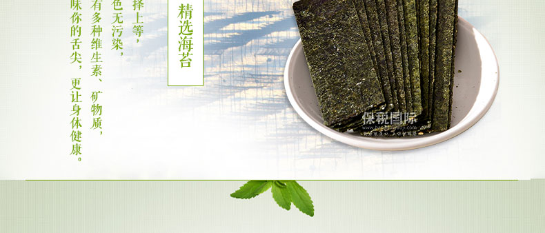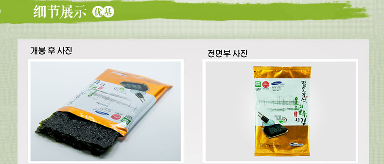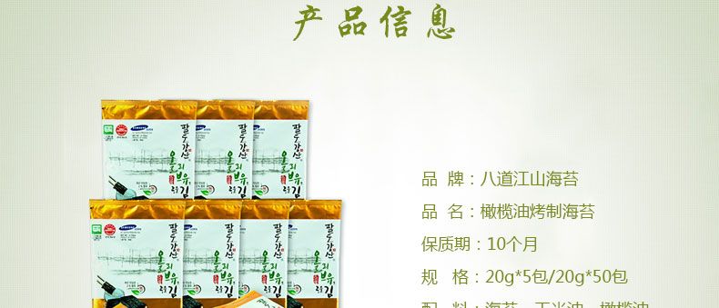 韓國八道江山海苔 橄欖油烤制海苔 即食烤海苔 獨立裝 20g/包 —— 1 上等的原料,用橄欖油烤制而成,香脆美味 2 豐富的蛋白質和維他命,適合兒童食用。 3 使用海鹽,無添加,不用擔心發胖,更加健康。 4 幾乎不含熱量,豐富的膳食纖維,同樣適合成年人食用 |