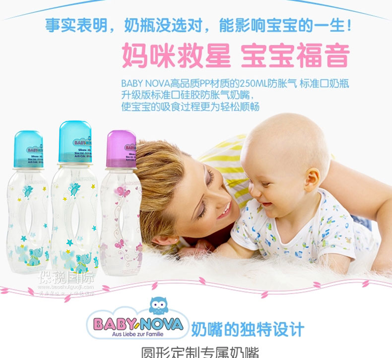 德國 Baby-Nova 標準口徑鏤空PP材質奶瓶 防脹氣嬰兒奶瓶(250ml)—— 1.瓶身上有不同標示的刻度,方便不同國家的用戶使用。 2.不含BPA,符合歐洲質檢標準EN14350。 |