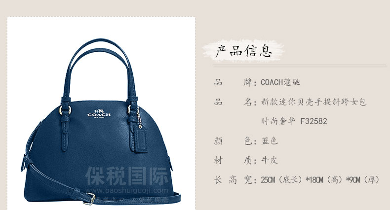 美國 Coach蔻馳 新款迷你貝殼手提斜跨女包 時尚奢華 F32582—— 1.選用頭層牛皮的斜挎手提貝殼包,甜美時尚。 2.保持干燥,存放于通風清涼處。 |