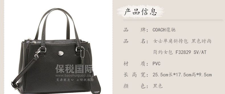 美國 coach蔻馳 女士單肩斜挎包 黑色時尚簡約女包 F32829 SV/AT —— 1.切記暴曬、火烤、水洗、撞擊和接觸化學溶劑。 2.手袋未經任何防水處理程序,沾濕手袋,請用軟布抹干,以防留有污漬或水印,而使表面出現褶皺。如果在雨天使用,應特別注意。? |