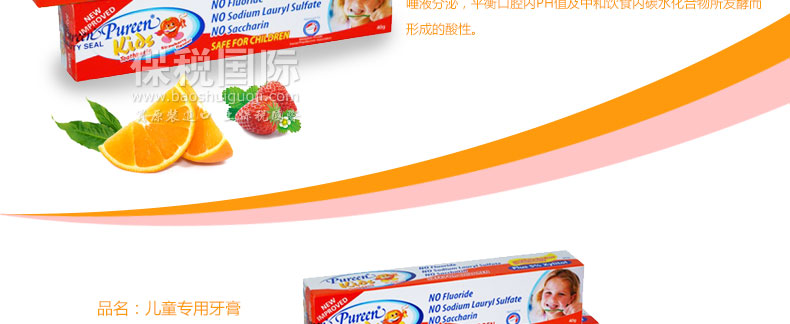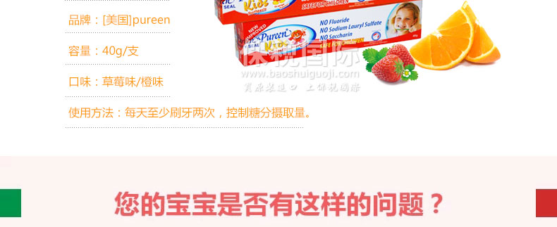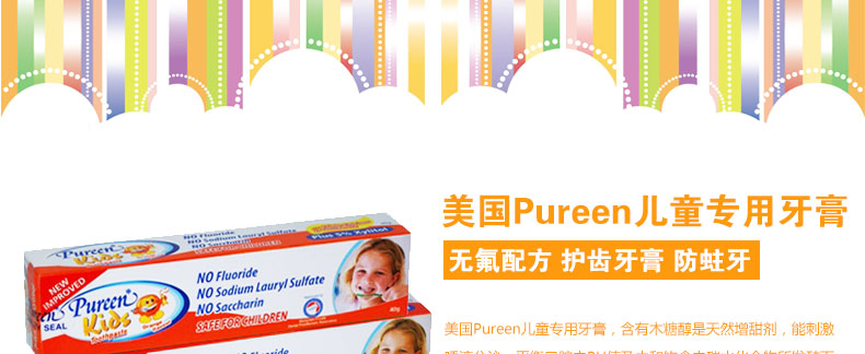 美國 Pureen兒童牙膏 無氟配方護(hù)齒牙膏 防蛀牙 草莓味/橙味 |