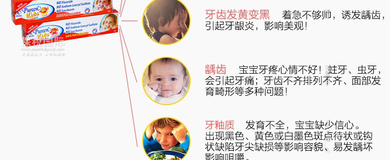 美國 Pureen兒童牙膏 無氟配方護(hù)齒牙膏 防蛀牙 草莓味/橙味—— 1.不含氟化物 (Fluoride Free)。 2.不含洗滌泡沫劑十二烷基硫酸 ( No Sodium Lauryl Sulfate)。 3.不含糖精(No Saccharin)加入5% Xylitol 及三倍鈣與磷酸鹽(Triple Calcium & Phosphate)預(yù)防蛀牙。 4.一歲或以上嬰幼兒可以使用。 使用方法:每天至少刷牙兩次,控制糖分?jǐn)z取量。 |