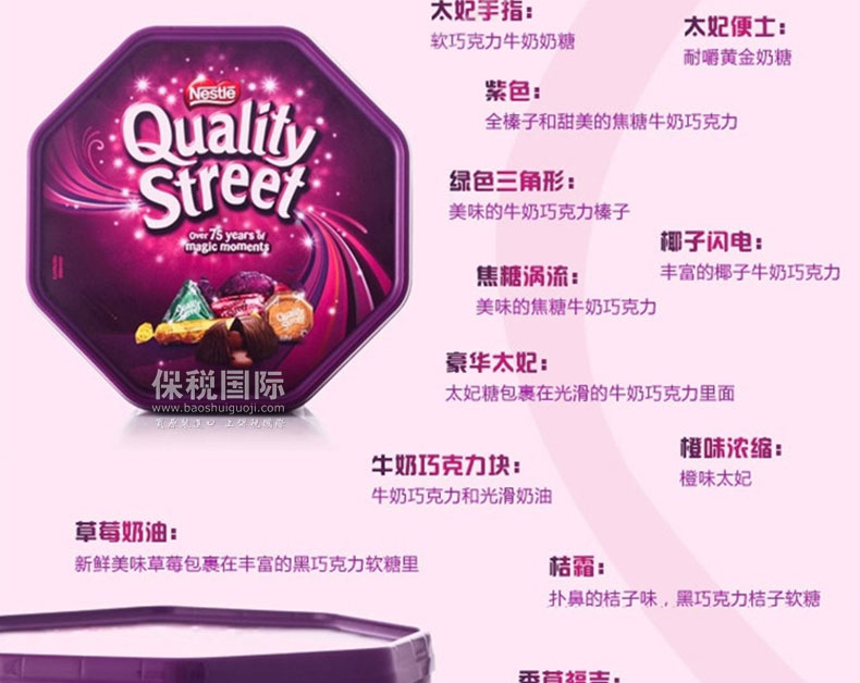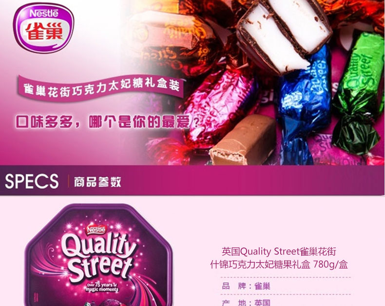英國Quality Street雀巢花街 什錦巧克力太妃糖果禮盒 香甜可口—— 來自英國的花街,沒有鬼鬼祟祟地扮健康,沒有自抬身價的以極黑巧克力姿態出現,它就是趾高氣昂地告訴用家:不甜又怎算是糖果呢? |