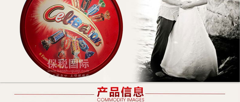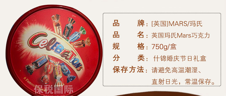 英國 瑪氏Mars Celebrations巧克力 什錦婚慶節日禮盒 8種口味—— 1.Celebrations是世界級食品集團Mars瑪氏旗下商標,同廠著名產品有M&M's,士力架,德芙巧克力等著名食品。 2.巧克力對人的情緒有積極的影響。吃巧克力后你會覺得有種爽快的感覺,這是因為此時你體內色氨酸(蛋白質組成部分)生成增加,促使心情好的激素---復安胺的生成。 |