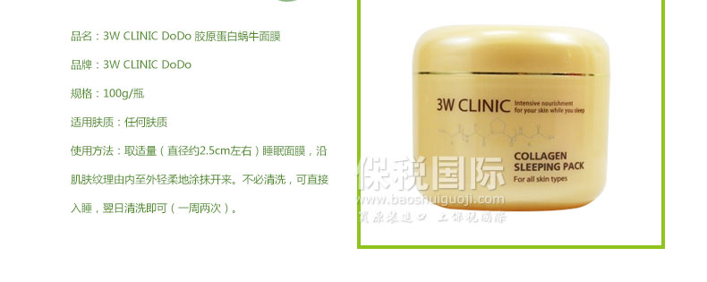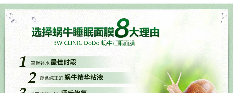 3W CLINIC DoDo 膠原蛋白 蝸牛補水保濕睡眠面膜 100g/瓶—— 1.清爽的凝膠型面膜,適用于任何膚質。 2.集營養、保濕、美白、修護于一體的頂級護膚品。 2.所含蝸牛分泌液成分具有強大的再生和修復功能。 使用方法:取適量(直徑約2.5cm左右)睡眠面膜,沿肌膚紋理由內至外輕柔地涂抹開來。不必清洗,可直接入睡,翌日清洗即可(一周兩次)。 |