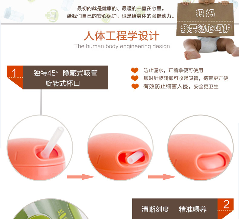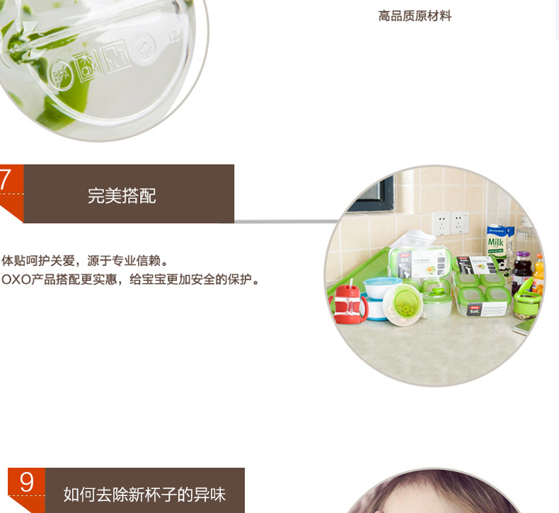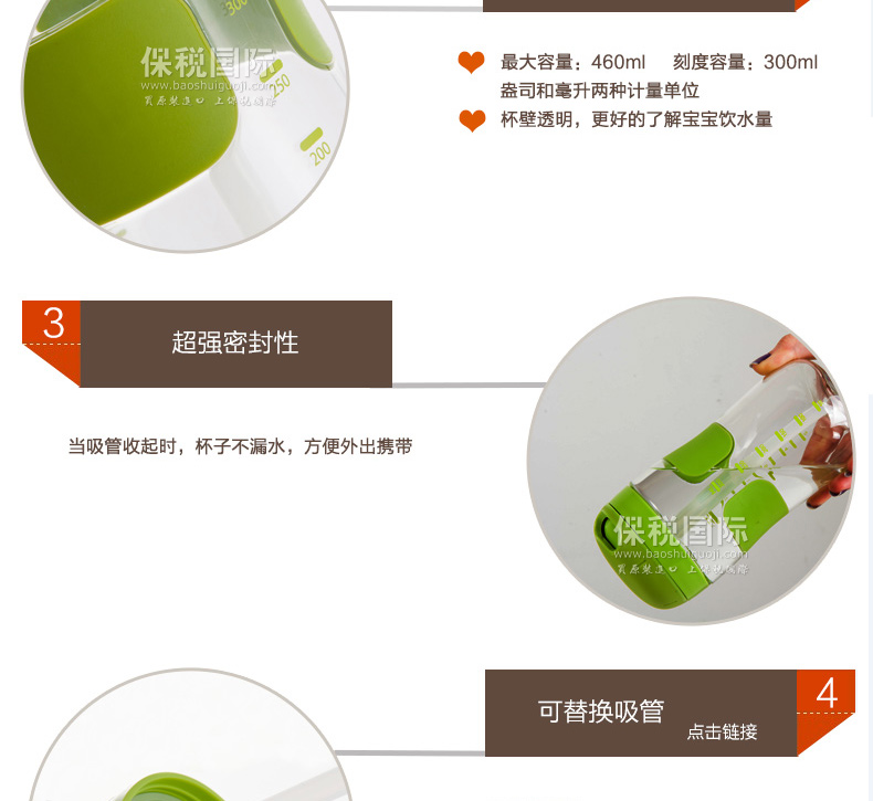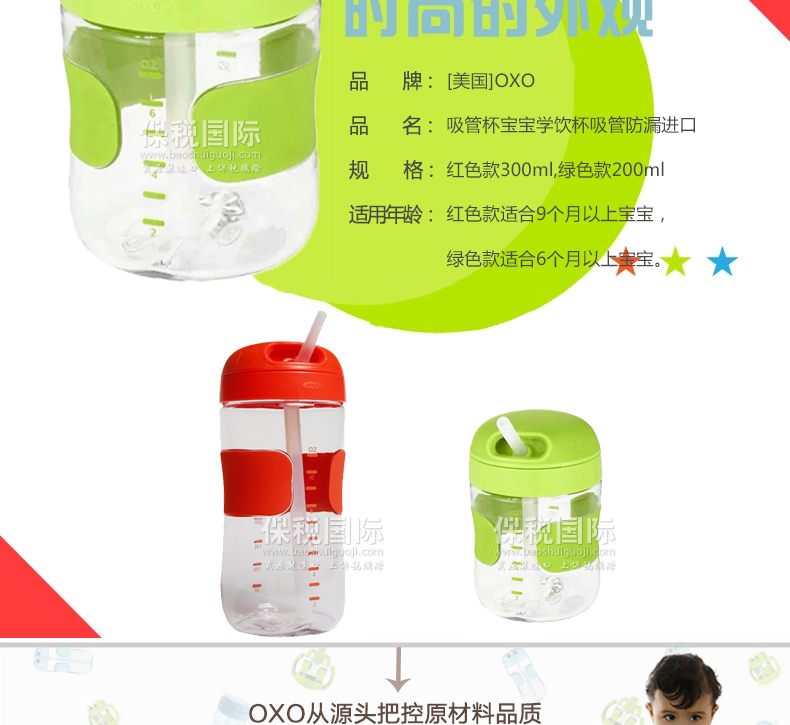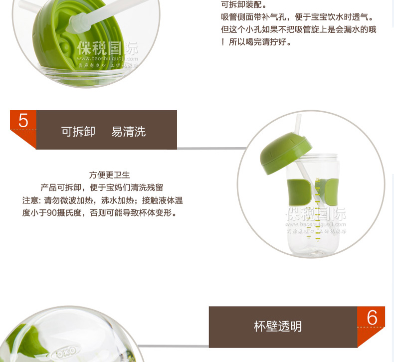 美國OXO TOT 吸管杯寶寶學飲杯吸管防漏進口兒童水杯 嬰兒飲水杯—— 1、進口食品級硅膠吸管,柔軟具有伸縮性,不傷害寶寶牙床; 2、杯身帶清晰刻度線,方便媽媽每次計量寶寶的飲用量,有盎司、毫升兩種計量單位; 3、防漏閥設計,防止溢漏; 4、空氣閥緩解壓力,方便寶寶小口抿喝; 5、蓋子有凹槽設計,給寶寶的小鼻子提供更多空間,以免喝水時蓋子堵住了寶寶的小鼻子; 6、杯身防滑易握; 7、所有配件皆可拆開和徹底的清洗,不含雙酚A,鄰苯二甲酸和PVC。 |